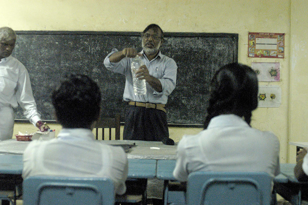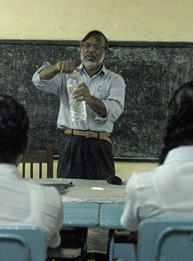 Lehrer demonstriert Methode, Wasser zu desinfizieren.