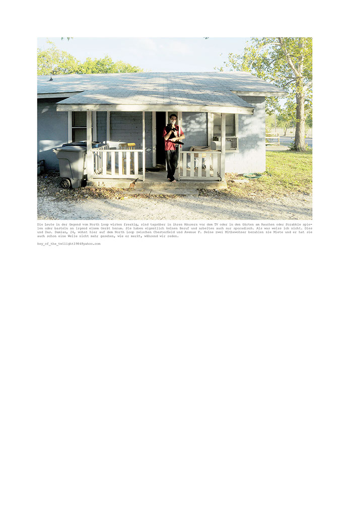 Die Leute in der Gegend vom North Loop wirken freakig, sind tagsüber in ihren Häusern vor dem TV oder in den Gärten am Rauchen oder Scrabble spielen oder basteln an irgend einem Gerät herum. Sie haben eigentlich keinen Beruf und arbeiten auch nur sporadisch. Als was weiss ich nicht. Dies und Das. Damian, 24, wohnt hier auf dem North Loop zwischen Chesterfield und Avenue F. Seine zwei Mitbewohner bezahlen nie Miete und er hat sie auch schon eine Weile nicht mehr gesehen, wie er merkt, während wir reden.