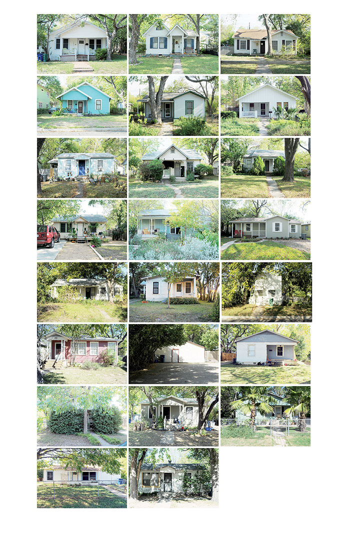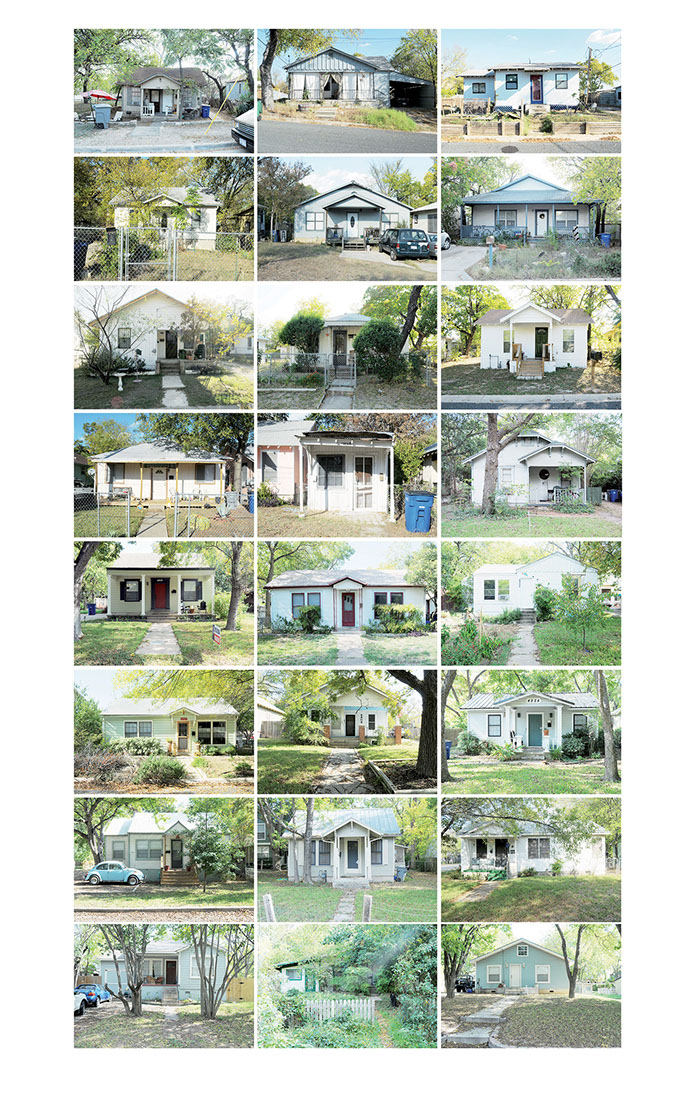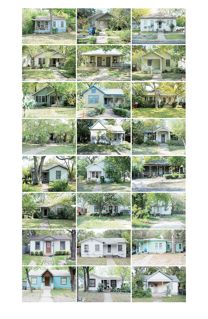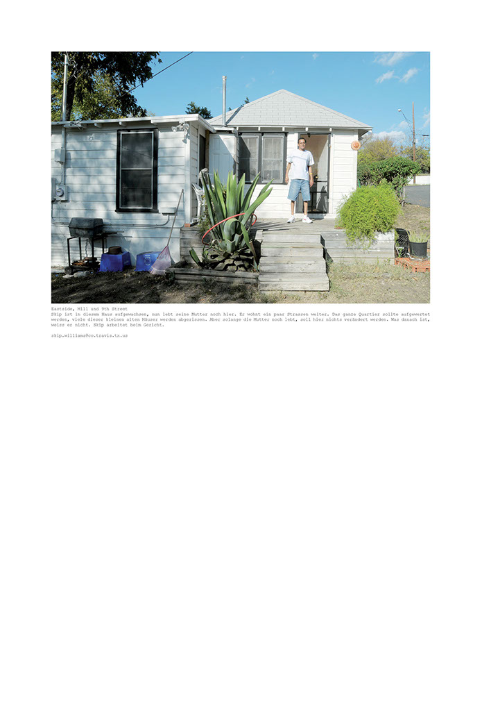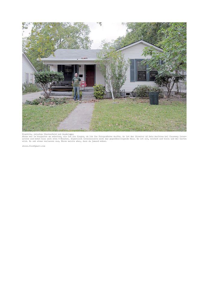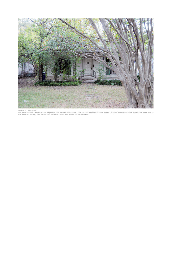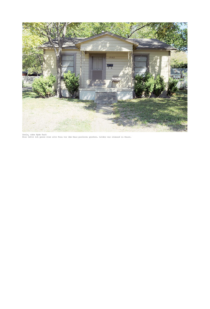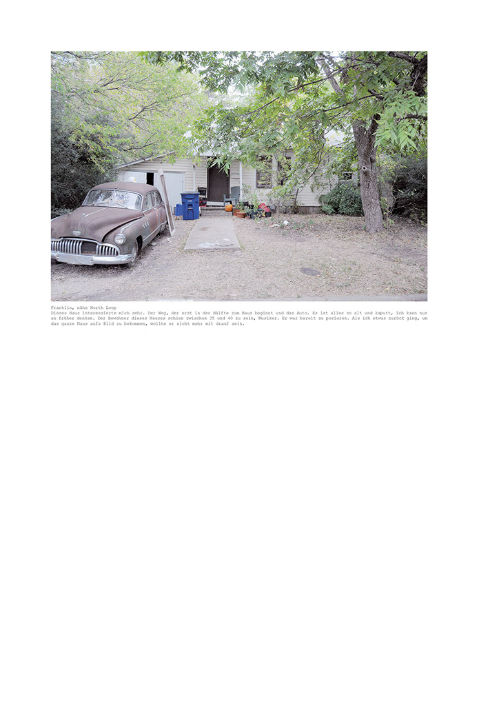 Am Anfang dachte ich, dass ich nur die Häuser fotografieren werde, die ganz genau der Idealvorstellung meines eigenen kleinen Heims entsprechen. Doch die Vorstellung schafft es einfach nicht in die Realität. Immer ist da etwas, das stört. Die Farbe, ein Glockenspiel auf der Veranda, Plastikstühle statt Holzschaukel, Ornamente an den Türen, ein modernes Auto in der Einfahrt, zu alt oder zu neu, zu gross oder zu klein. So entschied ich mich, grosszügiger zu fotografieren. Die Grösse und Form, die Farbe, das Alter des Hauses wurden wichtiger. Dann wiederum erschlug mich die Masse der Häuser, die plötzlich in meine Auswahl passten. Eine endlose Geschichte, die mir als solche doch zu wenig hergibt. Es geht mir ja nicht um das Dokumentieren der alten Quartiere Austins, vielmehr bin ich mit dokumentarischen Mitteln auf den Spuren meiner eigenen Fantasievorstellung und Sehnsucht nach einer bestimmten Art von Leben. Der Ausgangspunkt ist ein persönliches Anliegen. Die Suche nach der Art von Behausung, die mir heimelig scheint und in der ich mir vorstellen könnte, mich geborgen und wohl zu fühlen. Das Heim, das eigene Reich und die damit verbundene Vorstellung, wie und was man darin lebt. Das eigene Lebensszenario steckt mit darin.