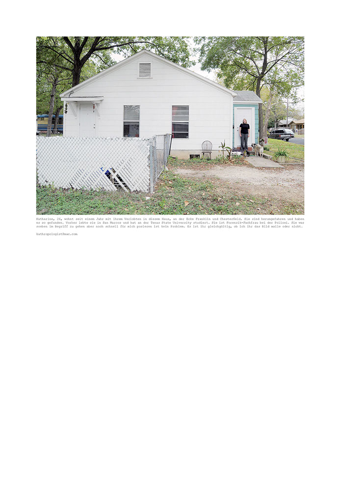 Katharine, 26, wohnt seit einem Jahr mit ihrem Verlobten in diesem Haus, an der Ecke Franklin und Chesterfield. Sie sind herumgefahren und haben es so gefunden. Vorher lebte sie in San Marcos und hat an der Texas State University studiert. Sie ist Forensik-Fachfrau bei der Polizei. Sie war soeben im Begriff zu gehen aber noch schnell für mich posieren ist kein Problem. Es ist ihr gleichgültig, ob ich ihr das Bild maile oder nicht.