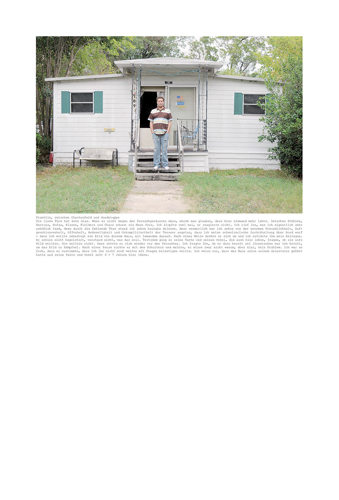 Die linke Türe hat kein Glas. Wenn es nicht wegen des Fernsehgeräuschs wäre, würde man glauben, dass hier niemand mehr lebte. Zwischen Stühlen, Kartons, Sofas, Kissen, Kleidern und Chaos schaut ein Mann fern. Ich klopfte zwei mal, er reagierte nicht. Ich rief ihn, was ich eigentlich sehr unhöflich fand, denn durch die fehlende Türe stand ich schon beinahe drinnen. Aber vermutlich war ich schon von der enormen Freundlichkeit, Aufgeschlossenheit, Offenheit, Redseeligkeit und Unkompliziertheit der Texaner angetan, dass ich meine schweizerische Zurückhaltung über Bord warf - denn ich wollte unbedingt ein Bild von diesem Haus, mit jemandem darauf. Nach einer Weile drehte er sich um und ich erklärte ihm mein Anliegen. Er schien nicht begeistert, verstand nicht, was das soll. Trotzdem ging er seine Tante und seinen Onkel, die auch hier leben, fragen, ob sie aufs Bild wollten. Sie wollten nicht. Dann setzte er sich wieder vor den Fernseher. Ich fragte ihn, ob er dazu bereit sei (inzwischen war ich bereit, um das Bild zu kämpfen). Nach einer Pause zuckte er mit den Schultern und meinte, er wisse zwar nicht warum, aber klar, kein Problem. Ich war so froh, dass er zustimmte, dass ich ihn nicht noch weiter mit Fragen belästigen wollte. Ich weiss nur, dass das Haus schon seinem Grossvater gehört hatte und seine Tante und Onkel seit 6 - 7 Jahren hier leben.