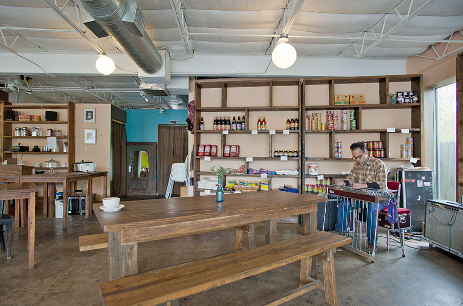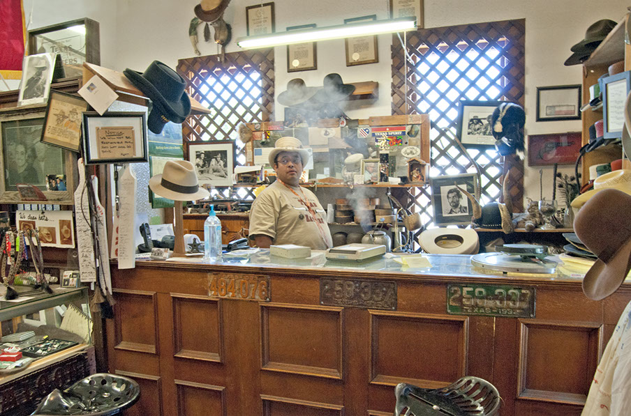 Mann steht hinter der Theke seines Hutmacher-Geschäfts.