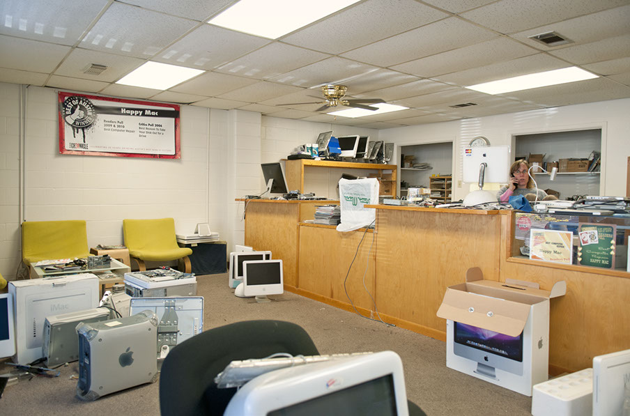 Frau sitzt hinter der Theke ihres Schuhmacher-Geschäfts.